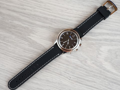 Кроме непосредственно часов, инструкции и гарантийного талона, в ней больше ничего нет. Модель выдержана в классическом стиле: корпус из нержавеющей стали с крупным циферблатом, довольно аскетичный дизайн, черный силиконовый ремешок прошит контрастной белой нитью.