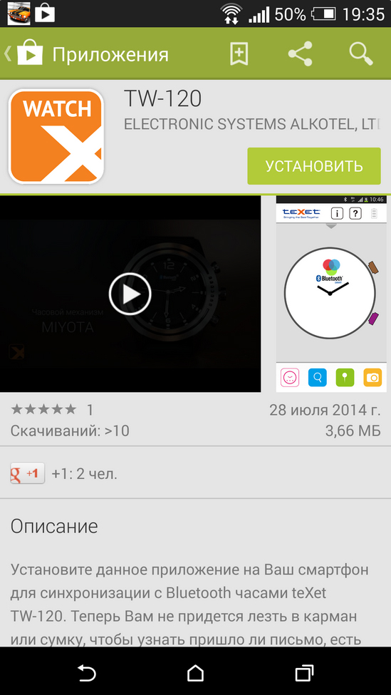 Расширить набор функций можно, связав часы со смартфоном по протоколу не ниже Bluetooth 4.0 LE, то есть, с низким энергопотреблением. Часы могут работать только с устройствами под управлением Android, для этого из Google Play необходимо загрузить бесплатное приложение TW-120, которое и позволит подключить часы к смартфону.