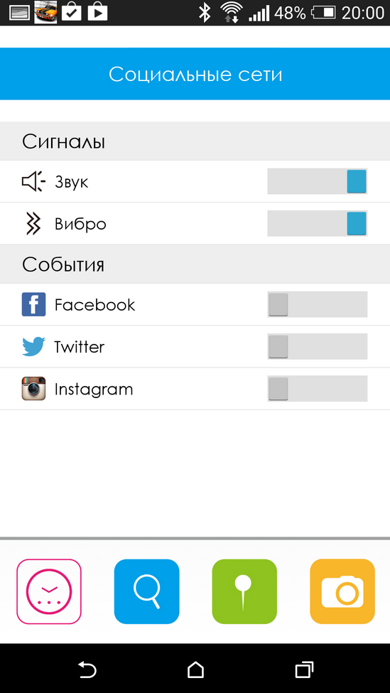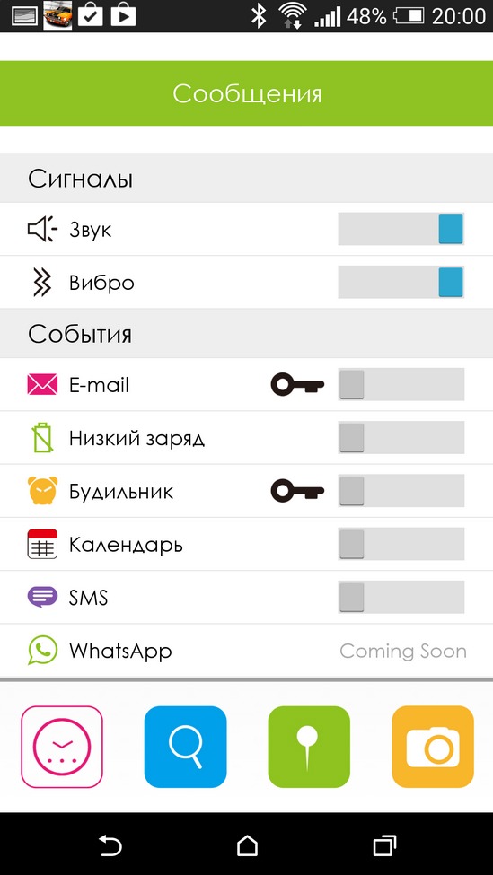 После сопряжения через главное меню можно настроить различные типы уведомлений, которые будут иметь свой цвет на LED-индикаторе. Красный цвет сообщит о входящих или пропущенных вызовах, зеленый – о новых SMS/письмах, событиях в календаре (вскоре планируется добавление поддержки WhatsApp и WeChat). Синий же информирует о новых событиях в соцсетях (поддерживаются Facebook, Twitter, Instagram). Все виды уведомлений могут сопровождаться как звуковым сигналом, так и вибрацией.