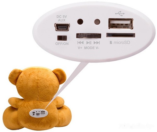 Помимо «плюшевого» дизайна и богатого функционала, Винни-Пух может похвастаться двумя мощными стереодинамиками, встроенными в его лапы и защищенными декоративными решетками, с их помощью он способен заполнить музыкой небольшое помещение, место пикника и отдыха на природе.