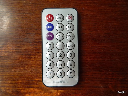 И в отличие от самой колонки, пульт оказался о-о-очень компактным, полностью умещающимся на ладони. Максимальная дальность сигнала – 6 метров; где именно в колонке расположен блок приема сигнала, в руководстве не сказано, достаточно просто направлять пульт в ее сторону.
