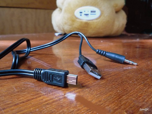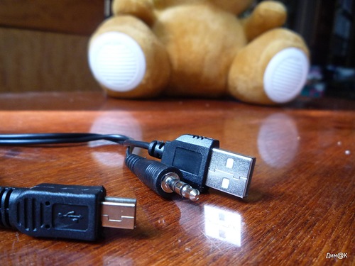 О комплектном кабеле (своеобразном хвостике ослика Иа) стоит упомянуть отдельно, т.к. он оказался достаточно необычным и не встречающимся в комплектации других устройств. С одной стороны он имеет штекер miniUSB (для зарядки встроенной батареи и соединения с внешними устройствами), а с другой – разветвление из 2 штекеров: полноценного USB (подключение к ПК или сетевому адаптеру для зарядки батареи) и 3,5 мм аудио (для подключения сторонних музыкальных устройств).
