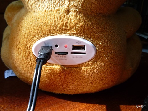 Емкость встроенного Li-Ion аккумулятора составляет 600 мАч (3,7 В), что обеспечивает колонку продолжительным временем автономной работы – до 10 часов музыки или несколько недель в выключенном состоянии (без вынимания батарейки), в стандартном режиме (недолгое прослушивание с непродолжительными перерывами) она продержится около недели. Если воспроизводимая мелодия неожиданно оборвалась, послышались негромкие щелчки (как при переключении режимов), а сама колонка перестала реагировать на команды с пульта и панели управления – значит Винни-Пух проголодался и нужно быстрее бежать за горшочком с медом, т.е. за зарядным устройством!