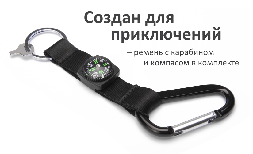 В комплекте с устройством идут запасные резиновые заглушки и удобный ремень с карабином и компасом. Смартфон можно закрепить на поясе, сумке, одежде удобно носить, оставляя руки свободными.