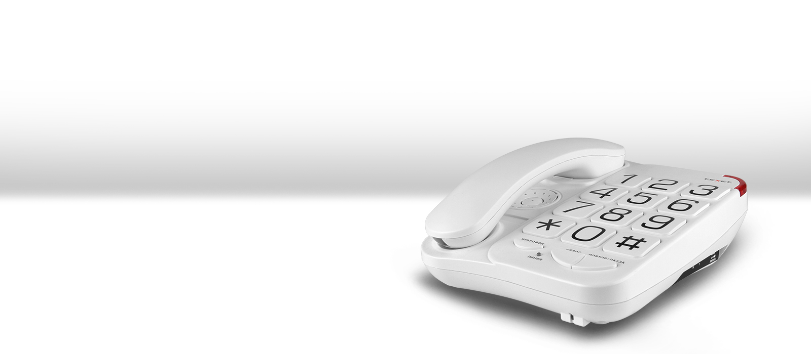 Телефон обладает базовым набором функций, таким как повтор последнего набранного номера, отключение микрофона, регулировка громкости сигнала, световая индикация звонка. Большие кнопки с надписями крупным шрифтом, эргономичная трубка с хорошей акустикой – это те преимущества, которые делают модель столь популярной среди пожилых пользователей.