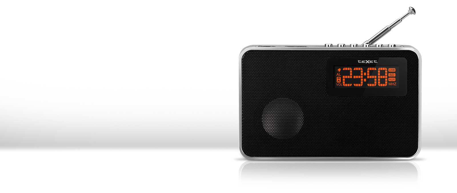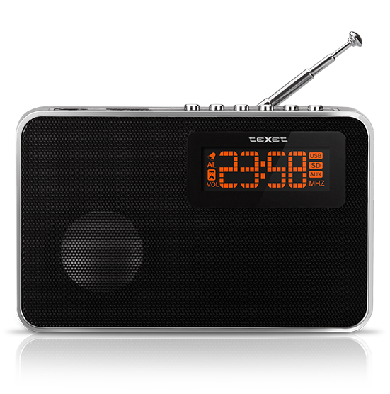 Активный фронтальный динамик 40 мм с выходной мощностью 3 Вт, LED-дисплей, расширенный FM-диапазон 76,0 - 108,0 MHz, линейный аудио выход mini jack 3,5 мм для подключения наушников и разъем AUX для подключения внешних устройств.