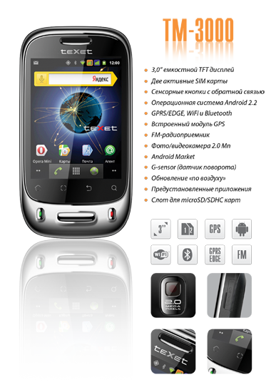 В новинке реализованы все востребованные мультимедийные функции. teXet TM-3000 воспроизводит основные форматы аудио, видео, графики и текстовых форматов, имеет встроенное FM-радио и фото/видеокамеру с разрешением матрицы 2.0 Мп.  Для передачи и обмена данными в новинке реализован Bluetooth и GPRS/EDGE, а для выхода в сеть Интернет предусмотрен WiFi. Встроенный модуль GPS позволяет использовать смартфон teXet в качестве миниатюрного навигатора.