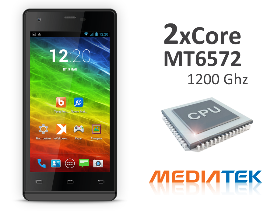 teXet X-medium plus по-прежнему имеет производительный двухъядерный процессор MediaTek MT6572 1.2 ГГц и 512 МБ оперативной памяти. Данных характеристик вполне достаточно для одновременного запуска нескольких приложений, воспроизведения видео высокого разрешения и мобильных игр.
