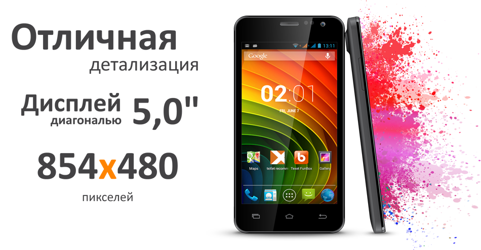 teXet X-maxi в ультратонком корпусе дает большой простор для самовыражения. Вариативный дизайн с разными сменными панелями и чехлом-книжкой, а также актуальные характеристики – мощный двухъядерный процессор, дисплей 5 дюймов и емкий аккумулятор – делают teXet X-maxi одним из самых выгодных предложений на рынке в сегменте смартфонов с большой диагональю дисплея.