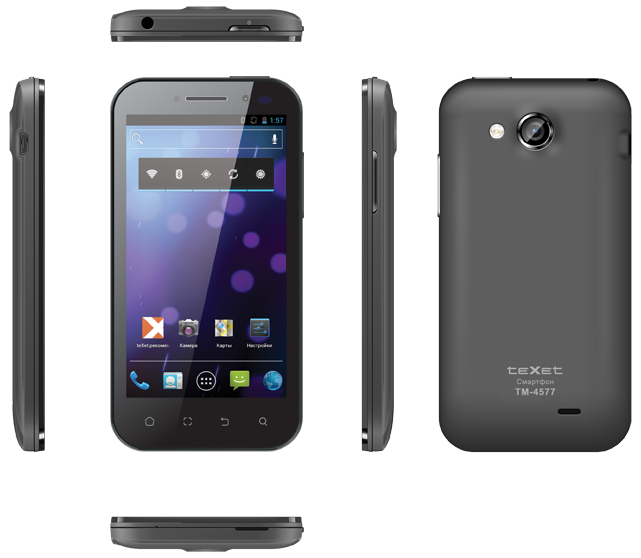 teXet TM-5277 и TM-4577 построены на двухъядерном гигагерцевом процессоре MediaTek MTK6577 (архитектура ARM Cortex-A9) и обладают 1 ГБ оперативной памяти – это стандарт для флагманских смартфонов образца 2012 года. Объем внутренней памяти устройства 4 ГБ, пространство для хранения файлов и установки дополнительного ПО легко расширить картами памяти объемом до 32 ГБ. Мощная «начинка» обеспечивает быструю работу в режиме многозадачности и моментальную реакцию на команды пользователя. Модели оснащены камерами с разрешением 5 мегапикселей, лицевыми 2-мегапиксельными камерами для видеозвонков. Работают смартфоны на операционной системе Android 4.0.3 с поддержкой сервисов Google и каталогом ПО «teXet рекомендует» с платными и бесплатными приложениями, оптимизированными для конкретных моделей устройств.