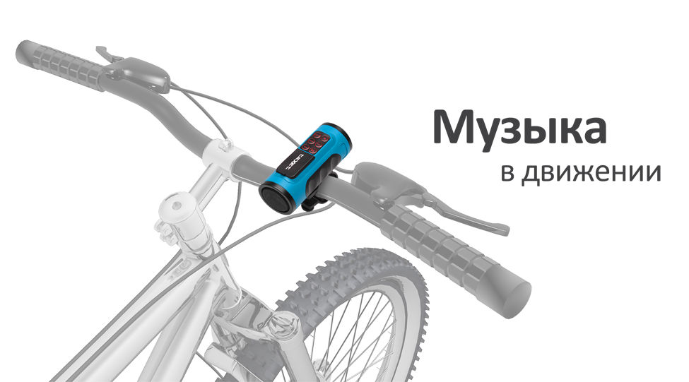 МР3-плеер надежно фиксируется на руле велосипеда с помощью специального крепления и останется неподвижным при езде по пересеченной местности.