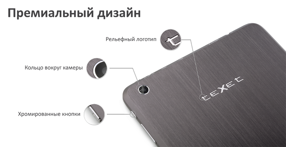 Точеные линии корпуса, благородный цвет, комбинация шлифованной и матовой поверхности алюминия, зеркальный блеск металлической кромки – стали визитной карточкой новой серии планшетов teXet. Дизайн и качество материалов TM-7853 и TM-7854 безупречны, без внимания не осталась ни одна деталь: новинки получили рельефный логотип, хромированные кнопки и кольцо вокруг объектива камеры, а стандартные винты были заменены технологичными винтами Torx в виде шестилучевой звезды.