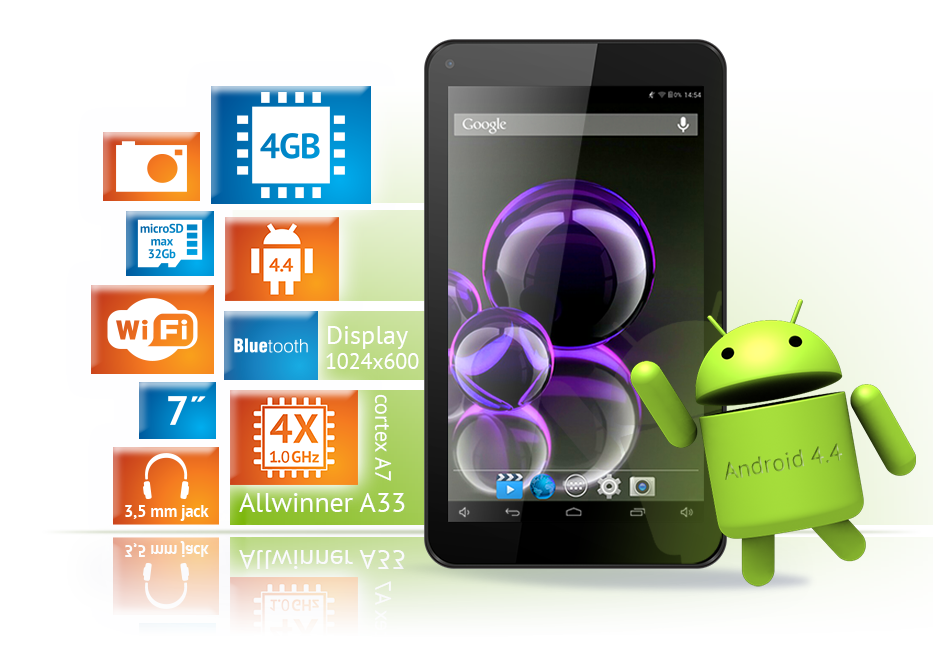 На планшете предустановлена операционная система Android 4.4 с фирменным дизайном иконок и рабочего стола. Устройство работает со всеми популярными форматами текста, видео, аудио и графики. Для хранения своей библиотеки можно использовать внутреннюю память объемом 4 ГБ или внешнюю карту памяти (до 32Гб).