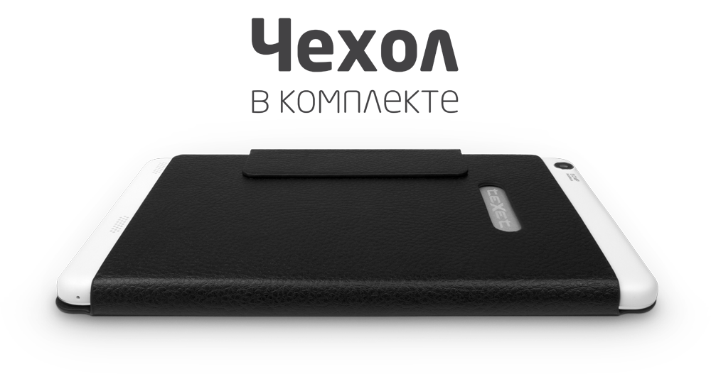 От механических повреждений корпус устройства надежно защищен тонким чехлом teXet, усовершенствованным исходя из пожеланий пользователей. При необходимости обложка превращается в универсальную подставку.