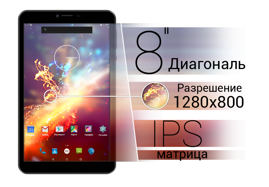Восьмидюймовый экран teXet TM-8043 с HD разрешением 1280 на 800 точек радует чёткой, сочной картиной с естественными цветами. Используется качественная IPS-матрица, которая обеспечивает большие углы обзора и высокую яркость: даже при ярком солнечном свете изображение не «выцветает».