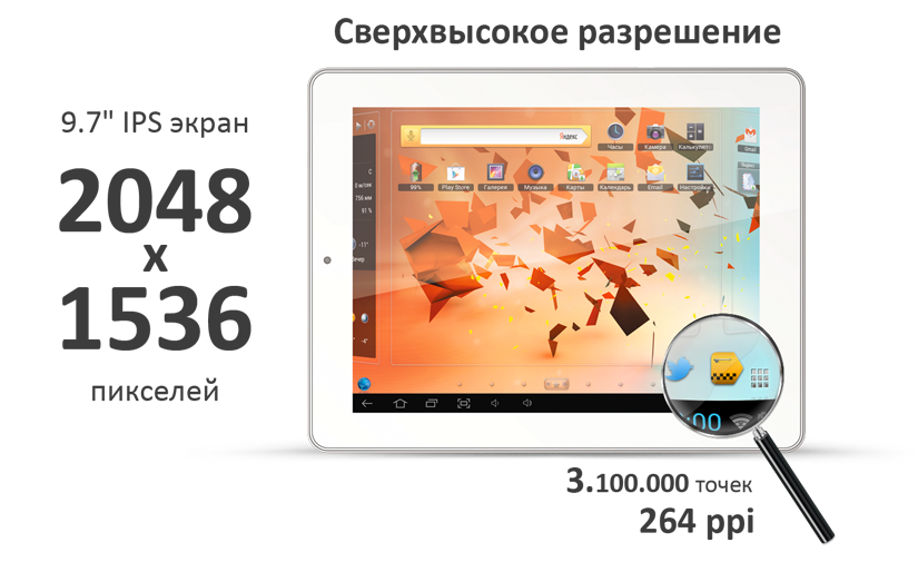 9,7’’, IPS, 2048х1536 пикселей, 264ppi