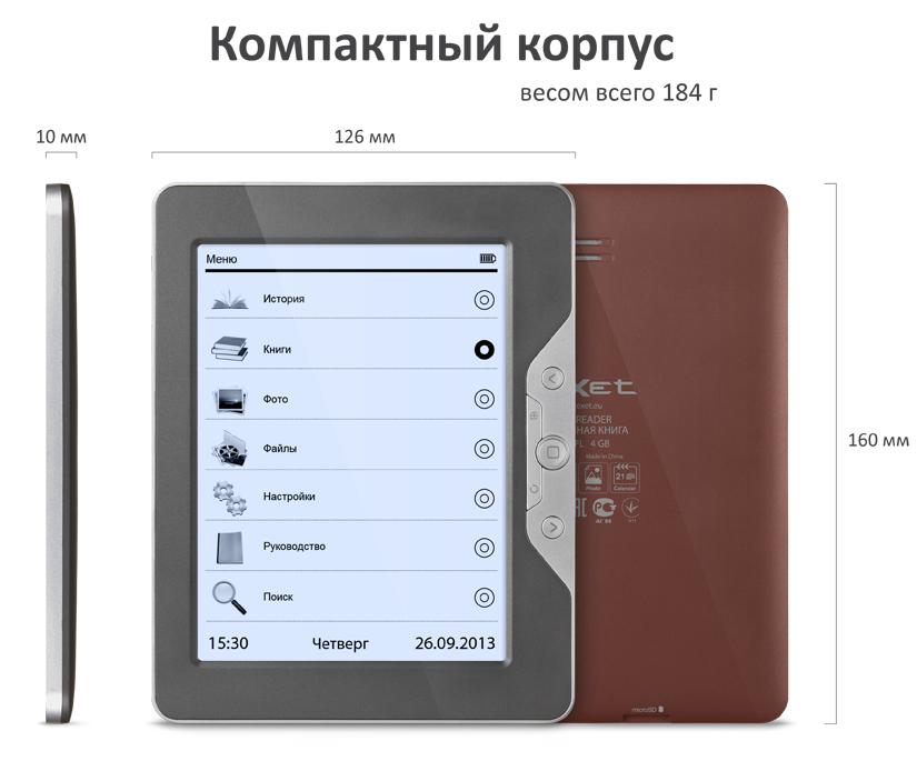 Собственная память 4 ГБ позволяет загрузить в устройство большое количество книг и всегда иметь под рукой личную библиотеку, при этом расширить объем для хранения данных можно за счет microSD/SDHC карт.