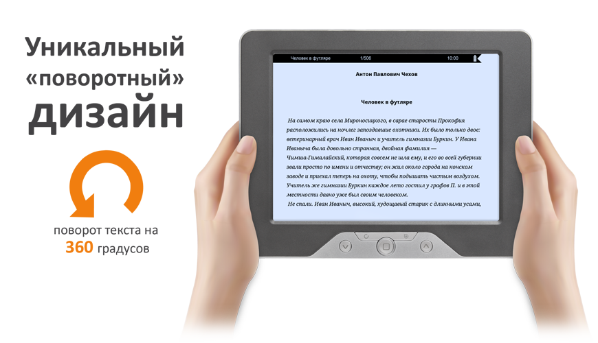 TB-116FL – одна из самых привлекательных моделей с точки зрения эргономичности и оригинального оформления в двух цветовых решениях. Тонкий 10-миллиметровый корпус весом всего 184 грамма делает книгу мобильным спутником в любой поездке. Еще одно достоинство модели – уникальный «поворотный» дизайн и возможность переворачивать текст на 360 градусов, что делает ридер одинаково удобным в управлении как правой, так и левой рукой. Помимо microUSB-кабеля и сетевого адаптера, в комплект входит новый фирменный чехол teXet. Тонкая обложка надежно защищает электронную книгу от царапин и других повреждений.