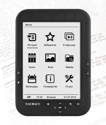 Как и большинство ридеров teXet, новая модель воспроизводит внушительное число текстовых форматов, включая самые востребованные DOC и DJVU. Пользователям доступны все инструменты для комфортного использования читалки: поддержка сносок, сохранение и удаление закладок, автоматический режим просмотра, форматирование (PDF Reflow), копирование и удаление файлов без использования ПК. Чтение электронных книг также возможно в инверсионном режиме; teXet TB-416 оснащена датчиком G-Sensor, который, в зависимости от положения книги, меняет ориентацию текста.