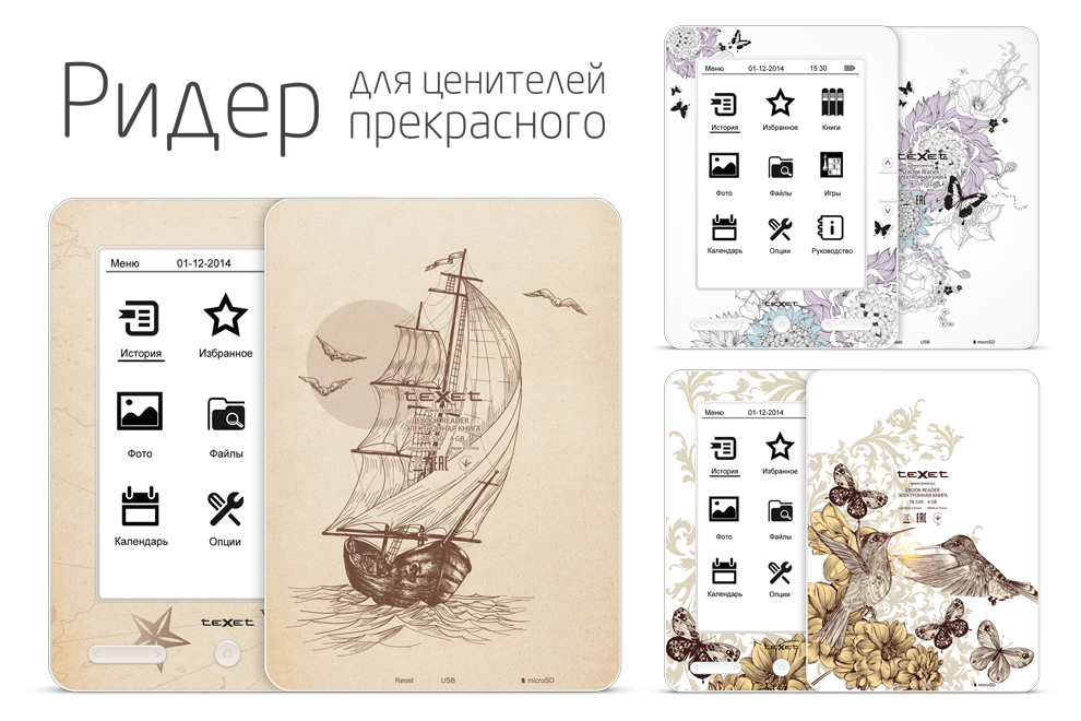 Команда teXet неоднократно удивляла поклонников классического чтения оригинальным оформлением электронных книг. teXet первым на российском рынке представил «карманный» ридер с дисплеем 4,3 дюйма (TB-446SE), тонкие и элегантные модели в Hi-tech дизайне (TB-536FL,TB-176FL), книгу с яркими цветовыми акцентами (TB-566). Новая революционная идея – украсить корпуса устройств декоративными принтами.