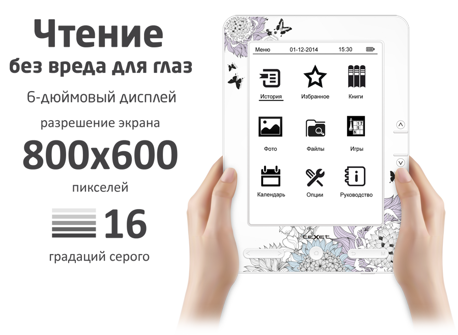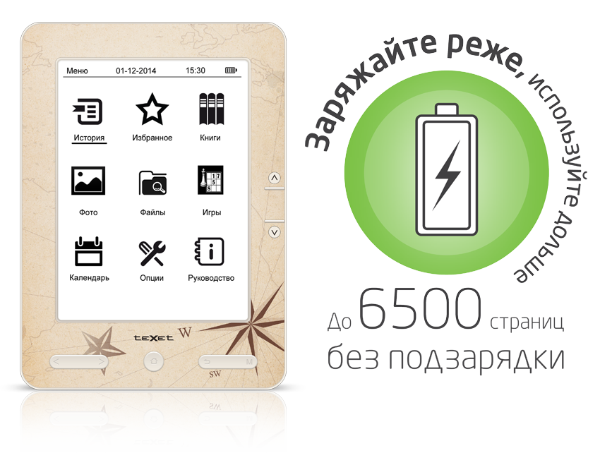 Смело берите электронную ридер в длительное путешествие без доступа к электричеству. teXet TB-550 экономно расходует ресурс аккумулятора и позволит прочитать до 6500 страниц без подзарядки.